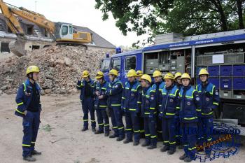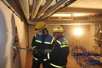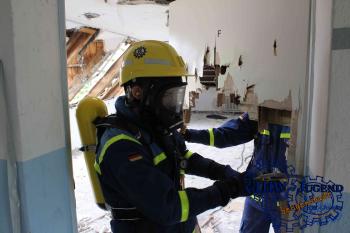 Nach der Besprechung der Führung wurden wir in gemischte Trupps eingeteilt. Unser Ziel war es möglichst viele Dummys (also Verletzte) aus einem Mehrfamilienhaus zu bergen. Und natürlich durften wir nicht einfach durch die offene Tür gehen, sondern mussten mehrere Wand- und Deckendurchbrüche machen. Dem entsprechend durften wir uns mit Vorschlaghmmern, Äxten und drei Wackern (Bohr- und Aufbrechhmmer) im Haus austoben.