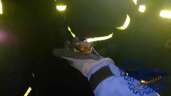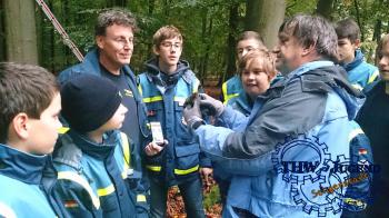 Schon hatte Hartmut die ersten Fledermauskästen, welche an Bäumen befestigt sind, ausfindig gemacht. Rauf auf die Leiter und schauen was drinnen ist - leer :-( Schon alles ausgeflogen, Richtung Winterquartier in den warmen Süden?! Wir könnten es verstehen ^^ Endlich, im dritten Häuschen, welche übrigens von unten angeflogen werden, die erste Fledermaus! Auch wenn Fledermäuse bereits seit 50 Millionen Jahre auf unserem Planeten zu Hause sind, diese hier war auf jeden Fall jünger :-) In Deutschland gibt es 23 der knapp 1000 verschiedenen Arten. Hartmut nahm sie vorsichtig raus und so konnten wir alle einmal diese niedlichen Säugetiere aus der Nähe betrachten. Und mit dem Ultraschallsensor konnten wir sie sogar hören, denn mit unserem menschlichen Gehör sind wir sonst nicht in der Lage diese Töne wahrzunehmen. Und so ging es dann weiter durch unseren Seligenstädter Wald und wir konnten noch den ein oder anderen "Kobold der Nacht" in unseren Händen halten. Aber aufpassen: Mit ihren spitzen Zähnen kommen sie sogar durch viele Handschuhe - auch wenn sie einem nicht weh tun wollen ;-) brigens stehen Fledermäuse unter Naturschutz! Falls ihr also mal eine in eurem Haus antrefft, sagt dem Nabu Bescheid, die holen diese dann gerne ab - man muss sie nicht töten, denn sie tun einem nichts! Bilder + Text: THW-Jugend Seligenstadt