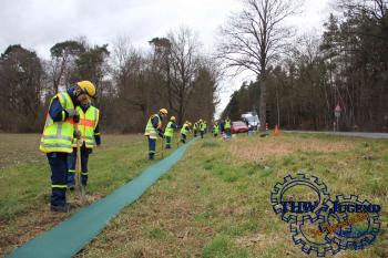 ... also ging es wieder einmal morgens um 8 Uhr los, ausgerüstet mit Spaten, Absperrmaterial und, und, und - ab Richtung Zellhausen. Dort trafen wir auf weitere freiwillige Helfer und auf unsere befreundeten Jungs, die THW-Jugend Bad Homburg :-) Da wir nun seit Jahren bereits kräftig üben konnten, waren wir in diesem Jahr extrem schnell... und stellten die nun 570 Meter Krötenzaun bis zum Mittag fast vollständig auf :-)) Nach einem kurzen Mittagessen mussten wir nur noch einige Kleinigkeiten erledigten und bevor das Wetter die Chance hatte schlechter zu werden hieß es auch schon: Zusammenpacken Jungs, wir haben es geschafft :-) Vielen Dank an die Hombies, dass sie uns auch in diesem Jahr tatkräftig unter die Arme griffen und keine Mühen scheuten! Nun sind wir bereits gespannt wieviele Kröten die Helfer in den nächsten Wochen in ihren Eimern finden können. Bis zum nächsten Jahr, wenn es wieder heisst "Die Kröten rufen"