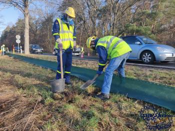 Nachdem sichergestellt wurde, dass wir sicher arbeiten konnten, ging es dann auch schon los. Aufgeteilt in 3 Trupps und mit der Unterstützung der Freiwilligen Helfer bauten wir den Zaun auf. Da wir 20 Mann von der THW Jugend und 15 weitere freiwillige Helfer waren, konnte man schnell einen Fortschritt sehen. Um 11:30 wurde eine Pause eingelegt und es gab eine kleinigkeit zu essen, welches die Gemeinde Mainhausen organisiert hatte. Nach der Pause musste noch ein paar Stellen an dem Zaun ausgebessert werden, sodass die Kröten nicht auf die Straße gelangen können.
