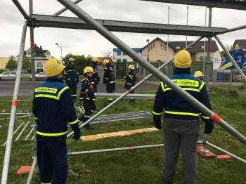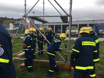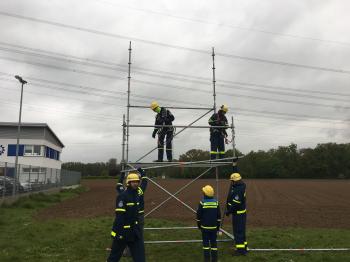 Heute am 22.4.2107 haben wir während unserer gemeinsamen Ausbildung mit dem technischen Zug ein Gerüst, auf 4 m Höhe mit einer Plattform, gebaut.